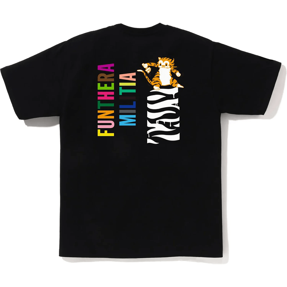 The BAPE MENS COLORS TIGER HEAD T-SHIRT Black is expertly crafted from premium cotton jersey, ensuring superior softness and breathability. The eye-catching rubber-printed tiger motif on the front adds a bold statement, while the stunning multi-colored design on the back captures attention from every angle.