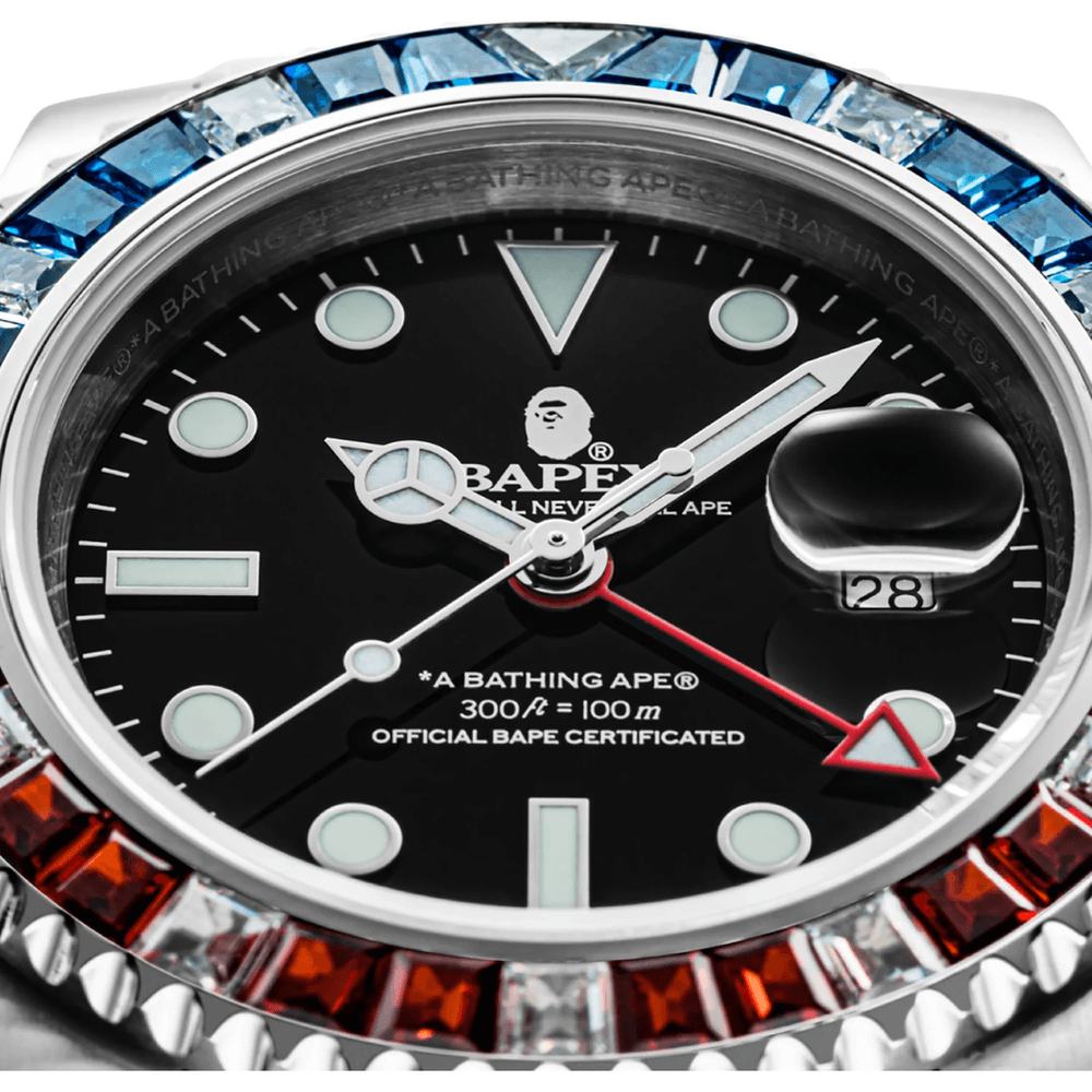 The TYPE 2 BAPEX CRYSTAL STONE MENS Blue x Red is a statement piece that stands out with its dazzling gemstone bezel and classic color palette. The 41mm dial is not only stylish but also practical, featuring a robust stainless-steel bracelet that adds weight and elegance. Whether you're dressing up for a special occasion or looking for a reliable everyday watch, this timepiece blends functionality with luxury.
