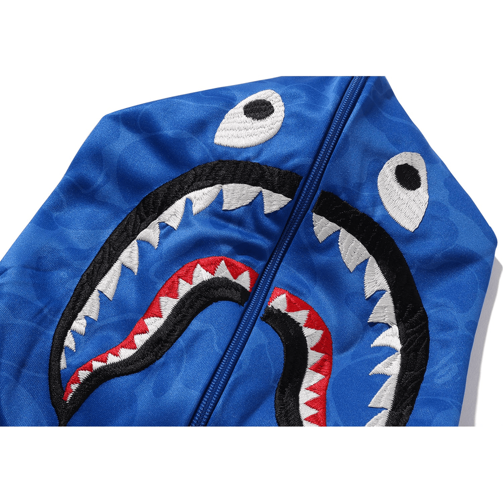 The BAPE Mens Solid Camo Relaxed Fit Shark Full Zip Hoodie Jacket Blue is designed for those who appreciate quality and style. The relaxed fit allows for all-day comfort, while the eye-catching camo print ensures you stand out in any crowd. Dress it up or down; this hoodie pairs effortlessly with matching items for a coordinated look.