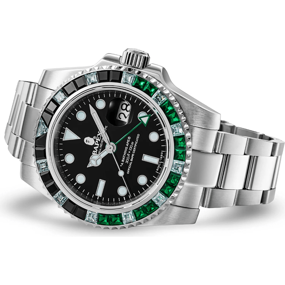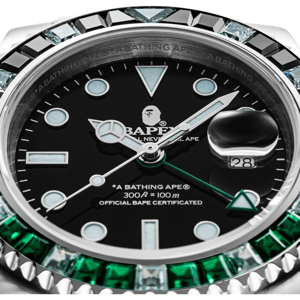Elevate your style with the TYPE 2 BAPEX CRYSTAL STONE MENS Black x Green, a luxurious reinterpretation of the classic Bapex® watch. This stunning timepiece features nearly 36 dazzling gemstones, making it a striking accessory for any occasion.