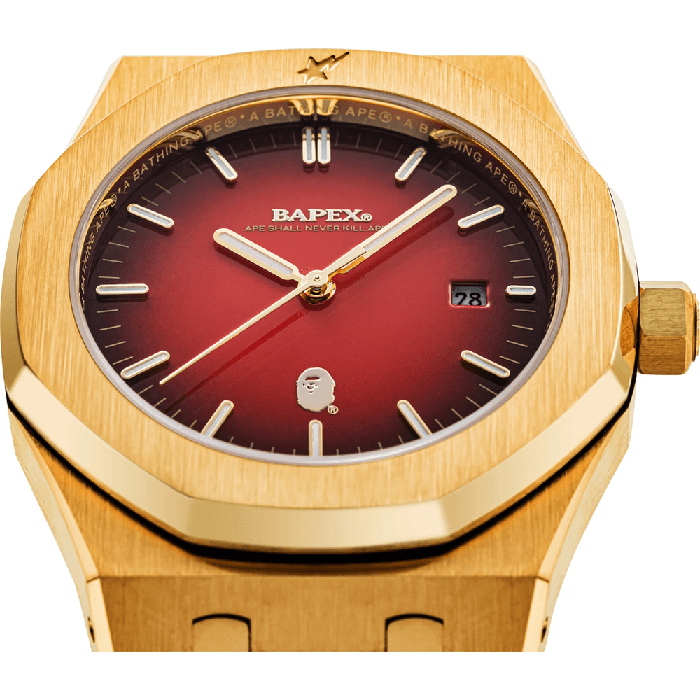 The TYPE 9 BAPEX #2 MENS Gold is not just a watch; it's a statement piece. Featuring a radiant gold-tone exterior and a bold crimson dial, this watch captures attention and complements any outfit. Its counterpart, the silver model with an emerald green dial, offers a unique alternative for those seeking variety.