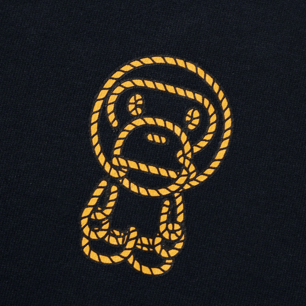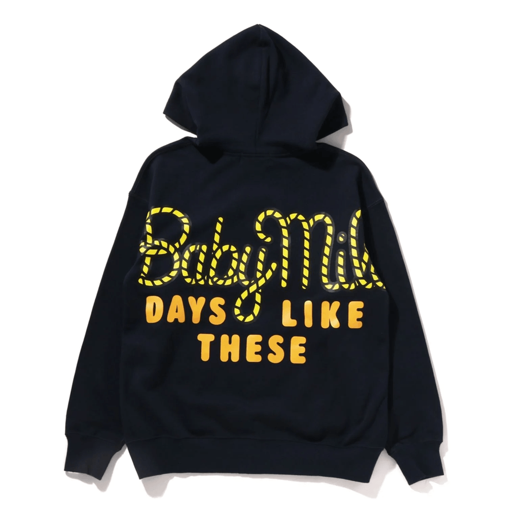 The Bape BABY MILO RELAXED FIT ZIP HOODIE JR KIDS Navy is perfect for cooler days or casual outings. Its soft brushed cotton fleece ensures your child stays cozy, while the distinctive Baby Milo graphics make it a standout piece. This hoodie is designed with a relaxed fit that allows for easy layering, making it suitable for various occasions—from playdates to family outings.
