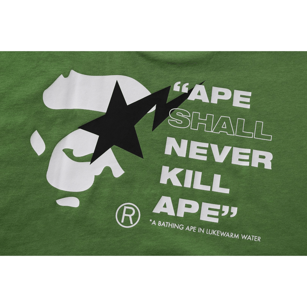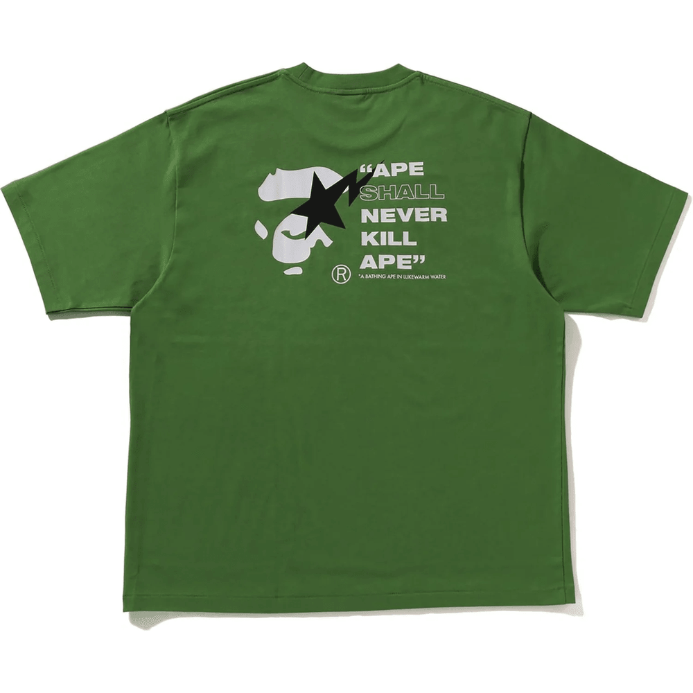 bape Sta Ape Face Relaxed Fit Tee Herre Grønn Er Ikke Bare En T-skjorte; Det Er Et Statement-plagg. Den Livlige Grønnfargen Gir Et Friskt Preg Til Ethvert Antrekk, Noe Som Gjør Den Ideell For Uformelle Utflukter Eller Avslapning Hjemme. Den Dristige Ape Face-grafikken På Forsiden Viser Din Unike Stil Og Kjærlighet Til Gatekultur.