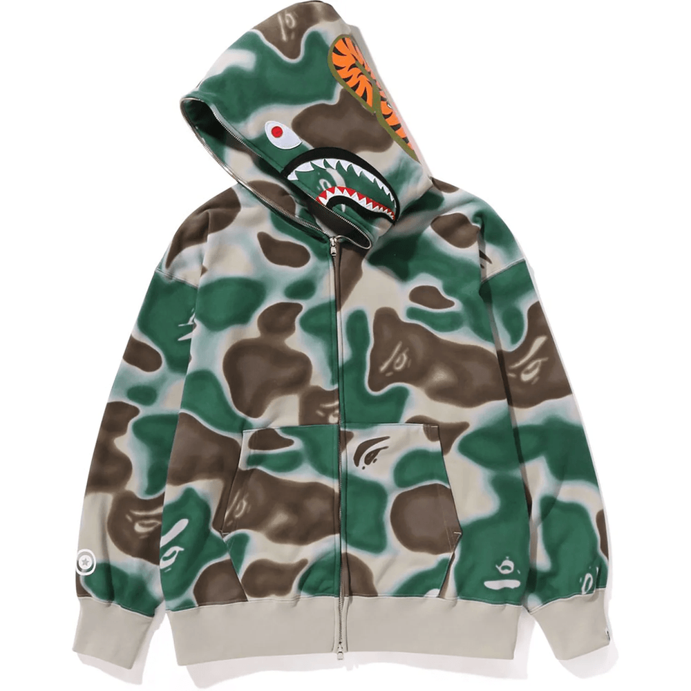 Bape Liquid Camo Shark Relaxed Fit Full Zip Hoodie for Men in Olivedrab