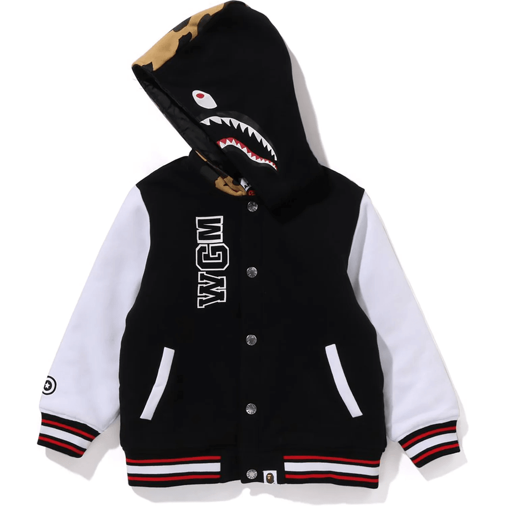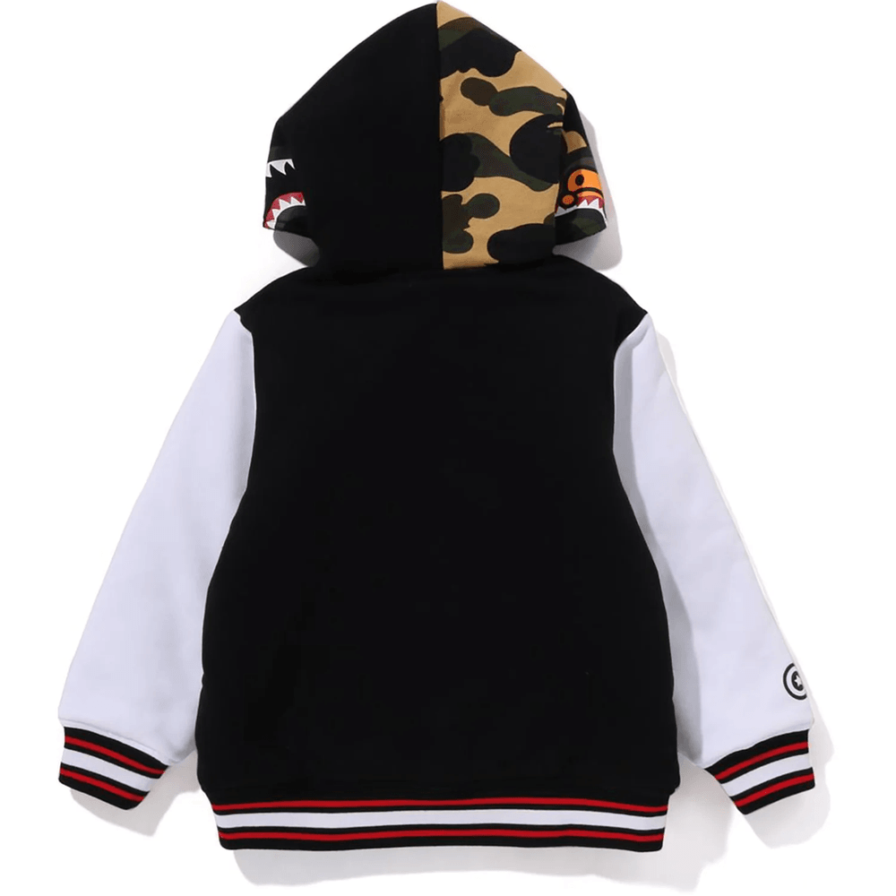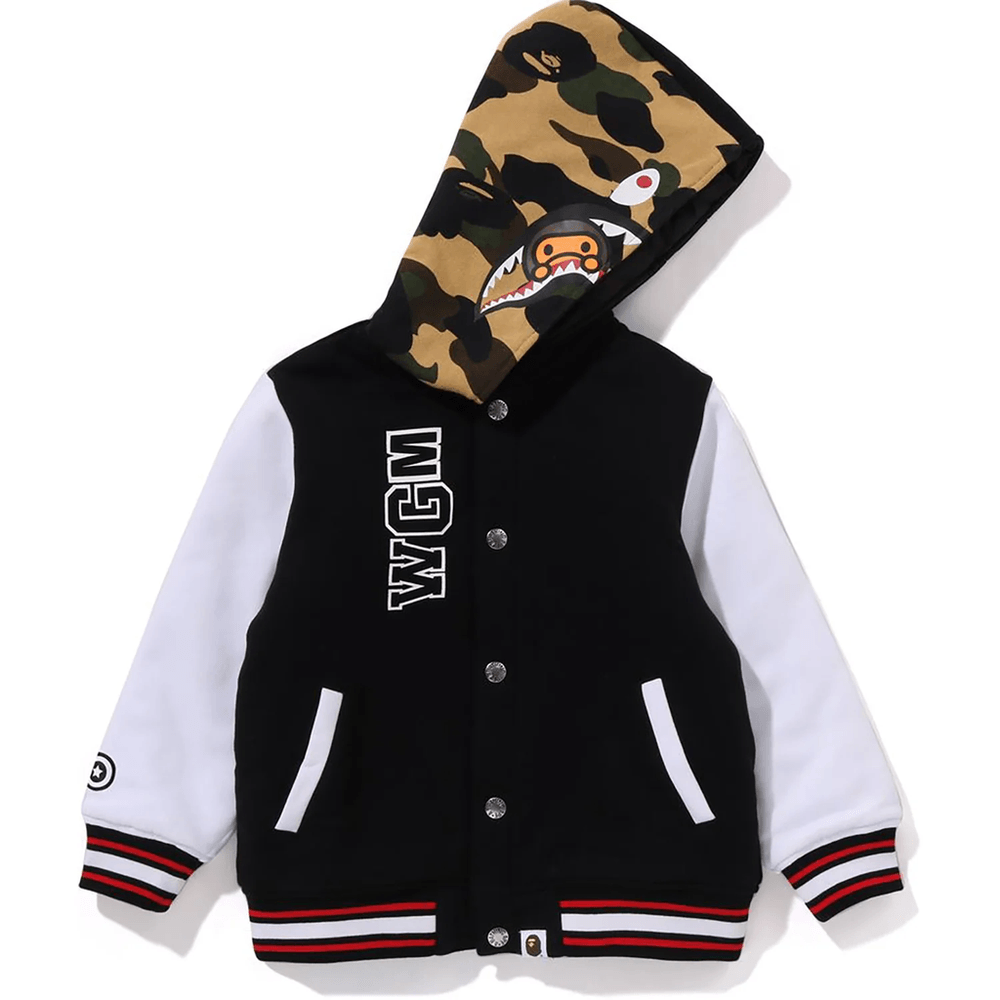 Elevate your child's wardrobe with the stylish Bape MILO SHARK HOODIE SWEAT VARSITY JACKET KIDS Black. This trendy varsity jacket combines comfort and fashion, making it a must-have for young fashion enthusiasts. Designed with a unique Milo shark motif and 1st camo pattern, it’s perfect for any casual outing or playdate.