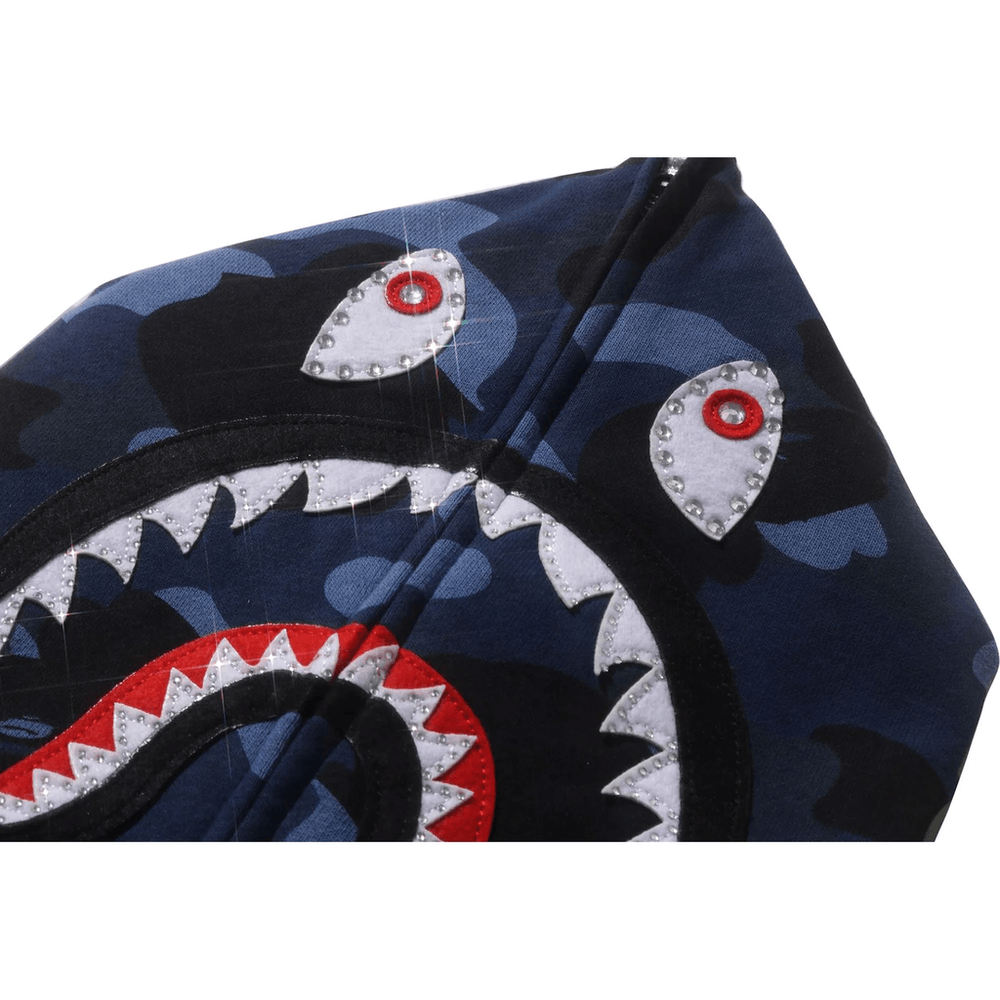 Elevate your streetwear game with the Bape COLOR CAMO CRYSTAL STONE SHARK CROPPED FULL ZIP HOODIE LADIES Navy. This stylish hoodie combines comfort and trendsetting design, making it a must-have for fashion-forward women.